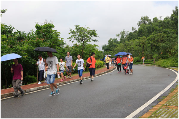 五月的鹏城,本应是烈日当空,却在活动当天早上迎来了倾盆大雨。风雨不会阻挡豪恩人的脚步,上午8:20分,全体职员准时集中在工业园。经过简短的动员仪式后,300余人分乘四辆大巴向东莞黄牛埔森林公园驶去。本次活动的路线是公常路路口——黄牛埔森林公园大门,行进里程约8公里。到达公常路路口后,大家开始沿着黄江黄牛埔水库段漫步穿越。