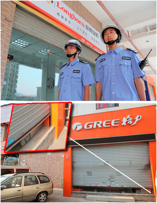 3分钟后,巡逻车到达事故现场。这是一间卖空调的商铺,保安人员首先对商铺周围进行了仔细巡查,没有发现可疑人员。考虑到蟊贼可能已经潜入到店内,他们首先用高音喇叭对店内喊话,确认无人后才对商铺进行检查。检查发现,商铺的卷闸门已经被撬开,门框变形。因为卷闸门被撬开,触动了安装在卷闸门上的无线报警门磁,他们到达现场时,商铺内的警号正在鸣响。