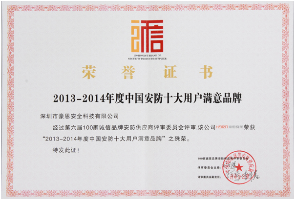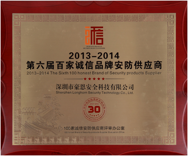 2013年10月28日,由永泰基业主办的“第六届100家诚信品牌安防供应商”颁奖盛典在深圳大中华喜来登酒店隆重举行。经过评审委员会的多次遴选和认真审议,豪恩荣获“30家金牌诚信品牌安防供应商”、“中国安防十大用户满意度品牌”殊荣。