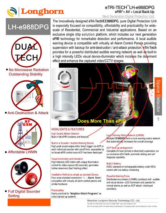 来自欧美、日本等地的众多国际知名安防企业参加了了此次“新产品展”(NPS)的角逐,在众多实力雄厚的对手竞争中,LH-e988DPG以黑马的姿态横空出世,一路过关斩将,引起了业内人士的强烈关注。经过现场讲解和演示操作,ePIR LH-e988DPG最终赢得了评审委员会的一致认可。该探测器拥有以下特点: