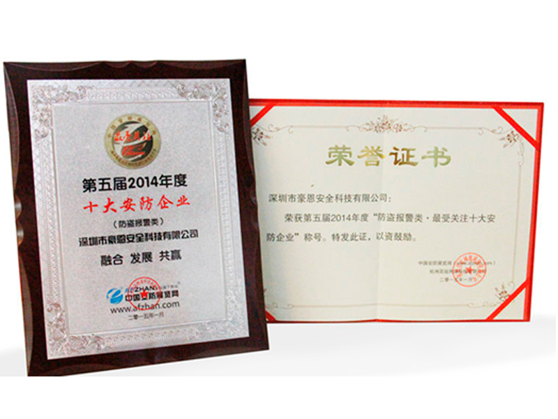 2015年3月16日,由中国安防展览网主办,备受业界关注的“第五届2014年度最受关注十大安防企业颁奖盛典暨2015年安防新技术创新及成果研讨会”在杭州召开,豪恩安防获得“最受关注防盗报警类十大安防企业”荣誉称号。