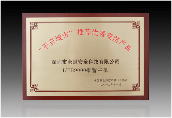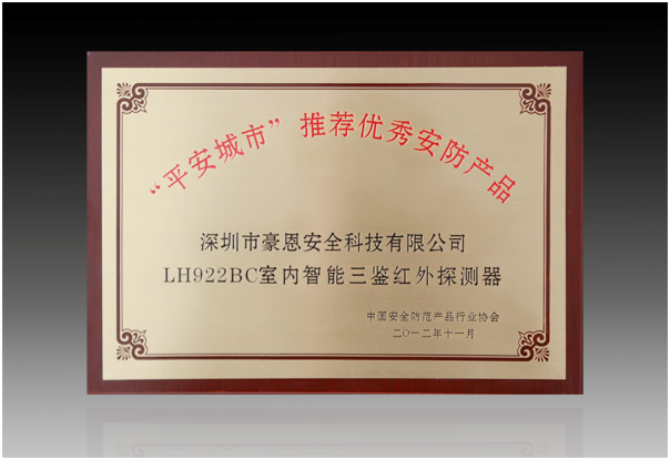 2012年12月3日上午9时,由中国安全防范产品行业协会主办的“2012年中国国际社会公共安全产品博览会(简称安博会)”开幕式在北京中国国际展览中心新馆隆重开幕。在开幕式上,中国安全防范产品行业协会颁发了 2012年“平安城市建设推荐优秀安防产品”的奖项,豪恩安防生产的LHB9000报警主机和LH922BC室内智能三鉴红外探测器荣获2012年“平安城市建设推荐优秀安防产品”殊荣。